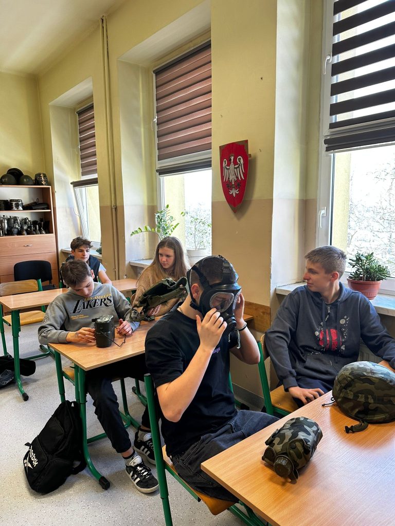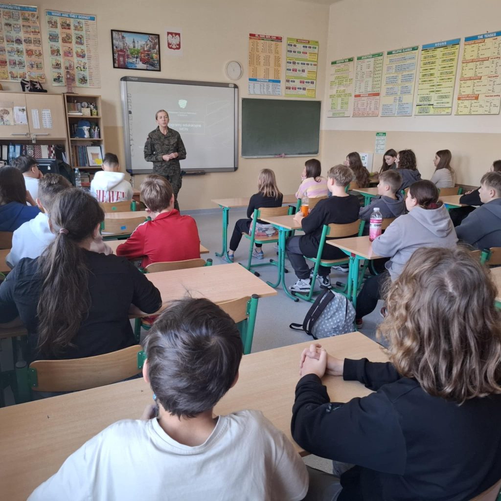 W piątek klasy 7 i 8 wzięły udział w spotkaniu ze starszym szeregowym specjalistą Anną Starczynowską – przedstawicielką Wojskowej Komendy Uzupełnień z Będzina. Uczniowie poznali ścieżkę kariery zawodowej żołnierza oraz dowiedzieli się jakie zawody można wykonywać podczas służby w wojsku będąc zawodowym żołnierzem (m.in. kucharz, mechanik, saper). Młodzież dowiedziała się jakie profity wiążą się z uczęszczaniem do klas o profilu wojskowym, jakie szkolenia można odbyć w ich trakcie, jakie przedmioty są realizowane w takich klasach oraz jakie umiejętności można pozyskać w trakcie nauki. Niezwykle interesujące były także informacje jak wygląda codzienna praca i życie żołnierza. Zajęcia były także okazją do przymierzenia atrybutów związanych z wojskowością.